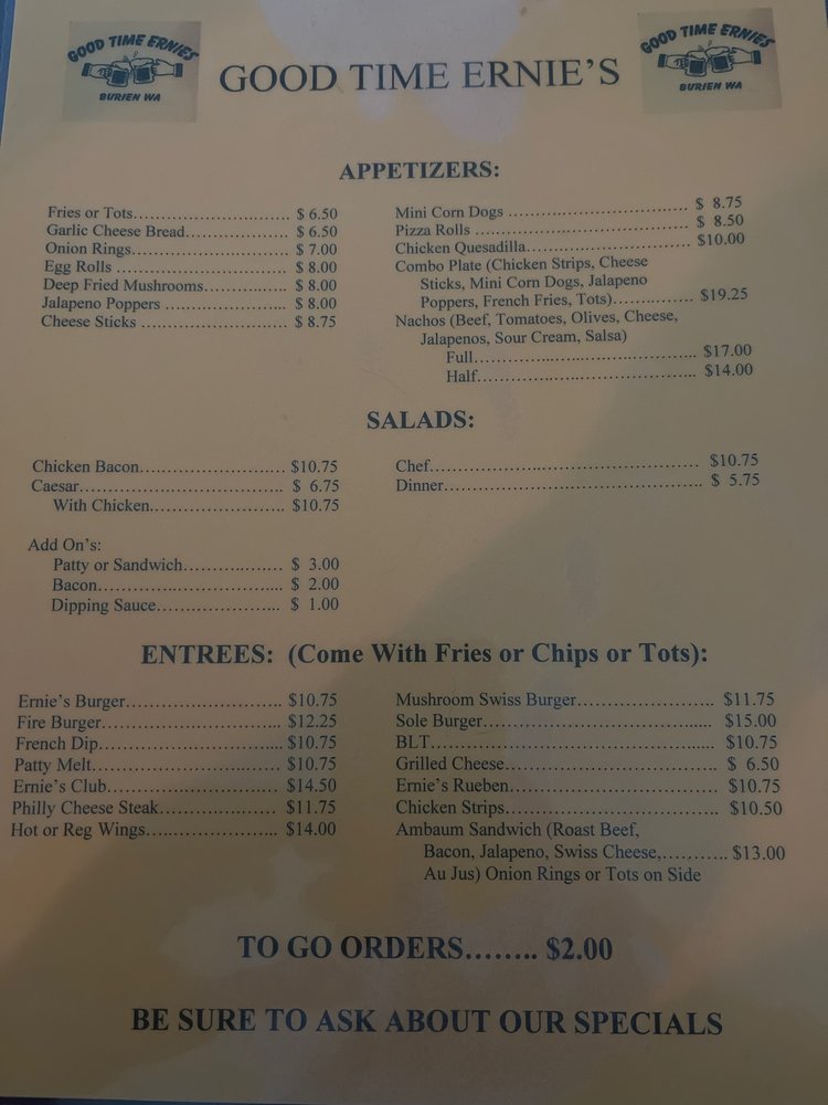 Located in Burien, Washington, Good Time Ernie's is a hidden gem that promises a memorable dining experience. This vibrant establishment offers a range of amenities, including outdoor seating, a full bar, pool tables, and even free Wi-Fi. The lively atmosphere is perfect for groups looking to unwind and enjoy good food and drinks.
